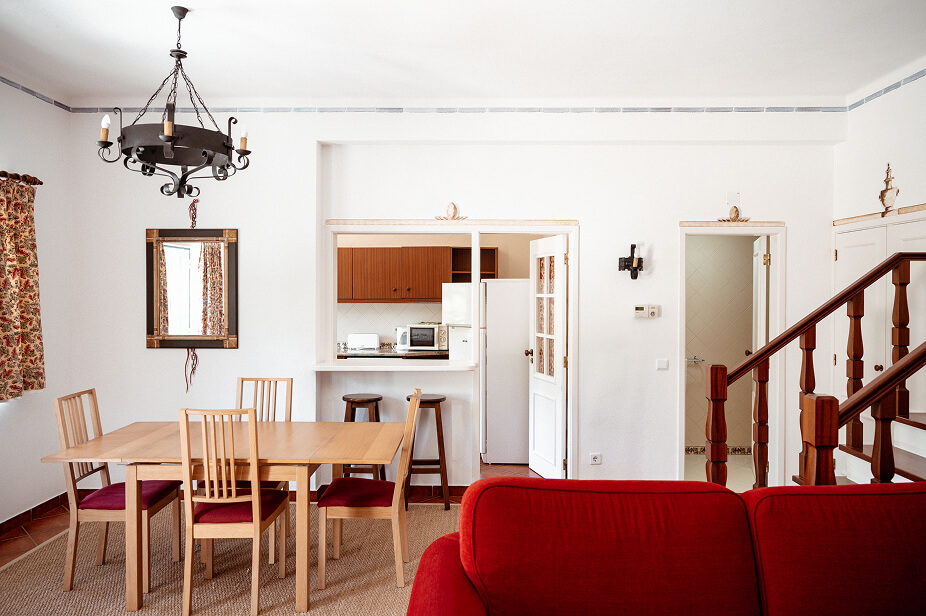 A sala de estar, acolhedora e bem equipada, proporciona um ambiente relaxante, enquanto a mesa de jantar acomoda até 4 pessoas, ideal para refeições em conjunto.